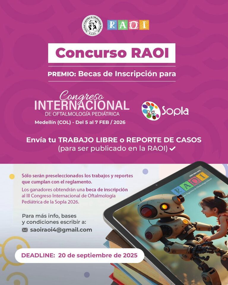 Concurso RAOI 2025: Becas de Inscripción para el Congreso Internacional de Oftalmología Pediátrica de la Sopla Leer noticia» 26 de junio de 2025